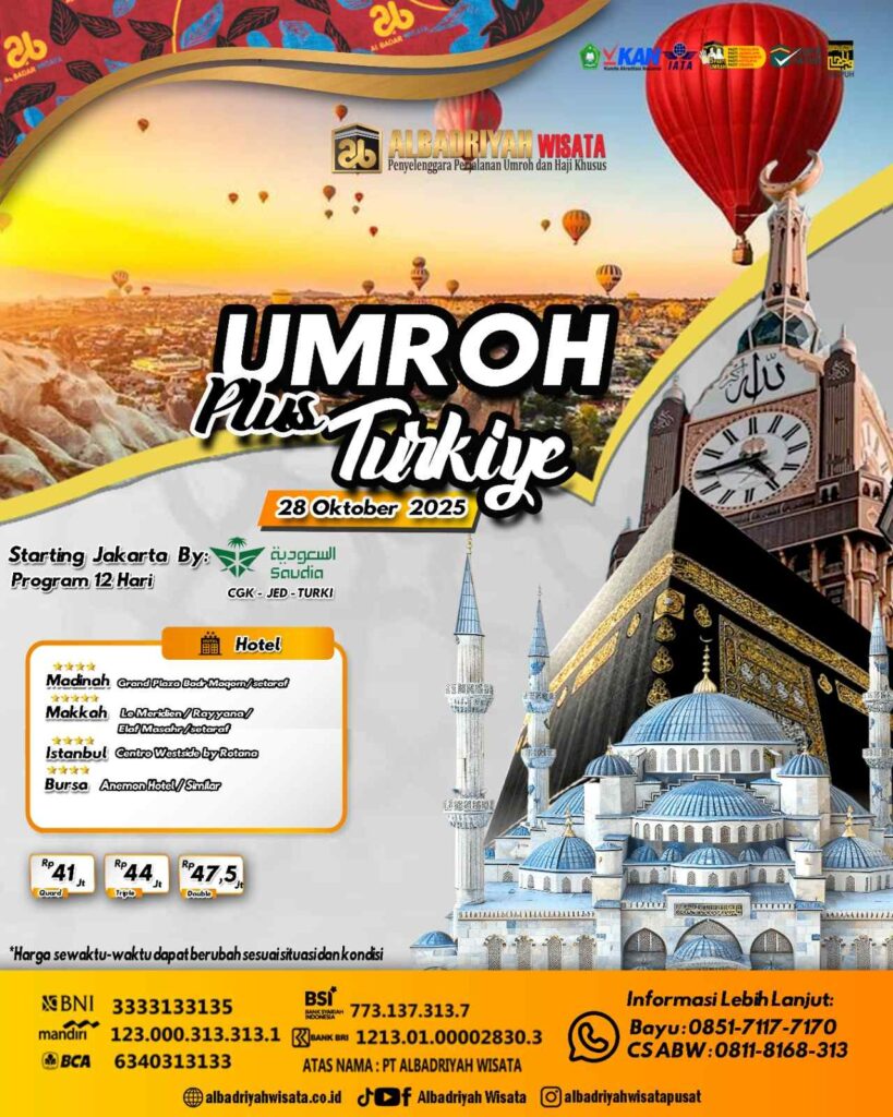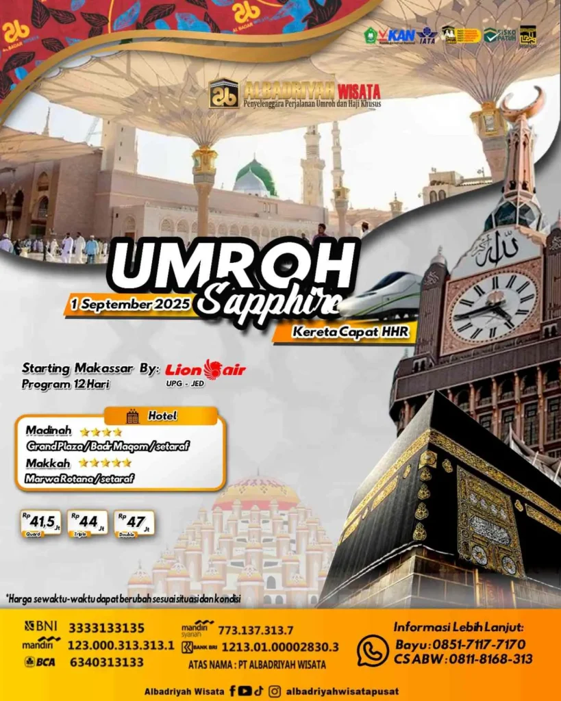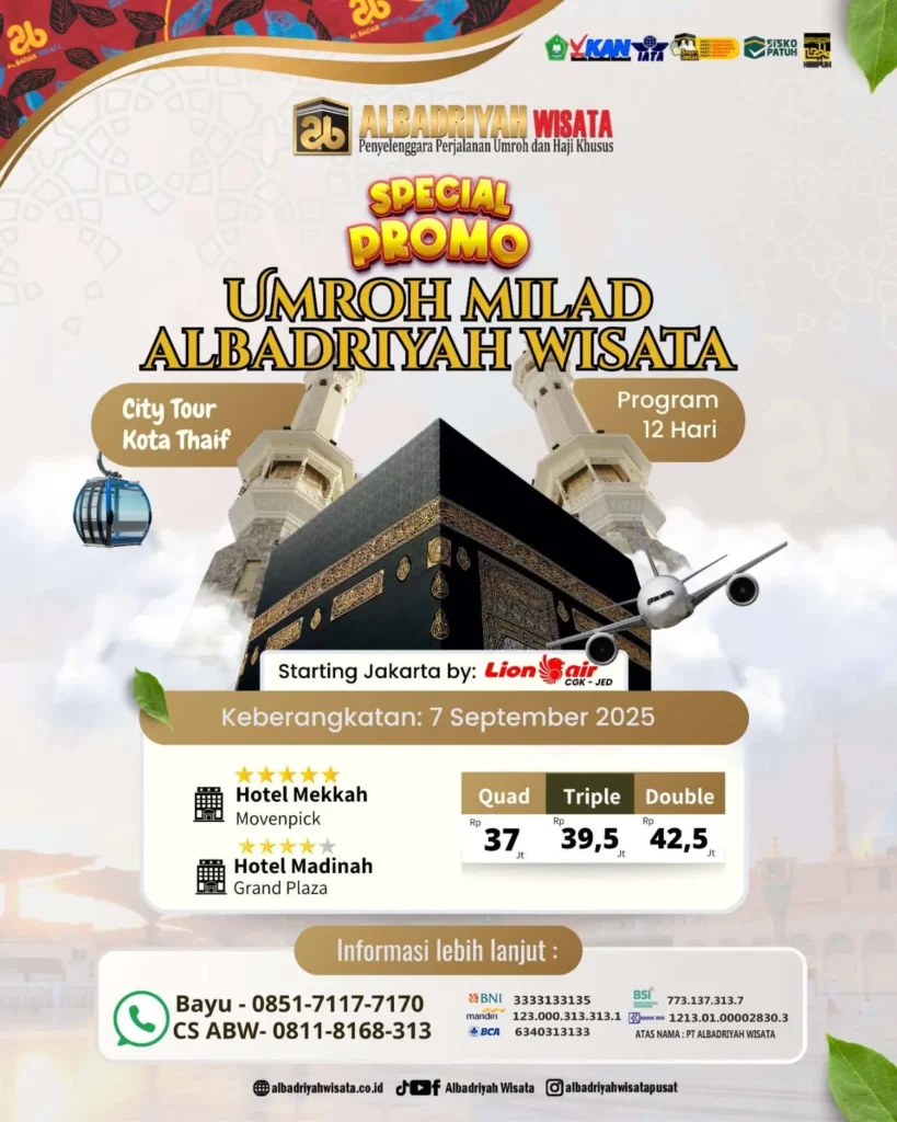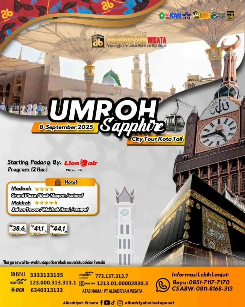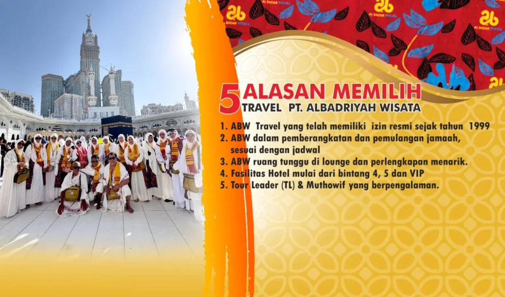 Setiap jiwa merindukan panggilan-Nya. Bersama PT. Albadriyah Wisata, kami hadir untuk mengantarkan Anda memenuhi undangan suci ke Tanah Haram. Dengan bimbingan penuh makna, fasilitas terbaik, dan komitmen sepenuh hati—kami bukan sekadar penyedia jasa, kami adalah sahabat dalam setiap langkah menuju ampunan dan keberkahan.