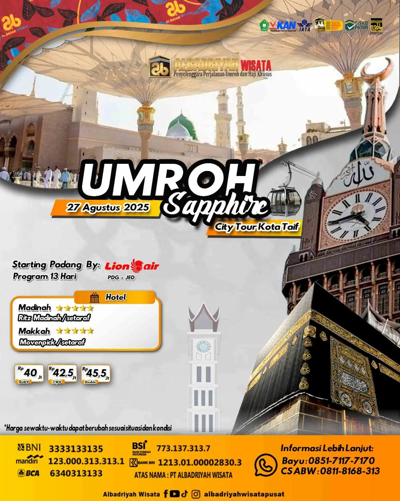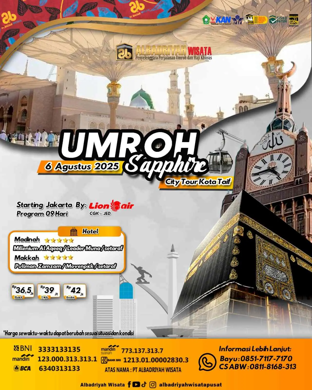 Setiap jiwa merindukan panggilan-Nya. Bersama PT. Albadriyah Wisata, kami hadir untuk mengantarkan Anda memenuhi undangan suci ke Tanah Haram. Dengan bimbingan penuh makna, fasilitas terbaik, dan komitmen sepenuh hati—kami bukan sekadar penyedia jasa, kami adalah sahabat dalam setiap langkah menuju ampunan dan keberkahan.